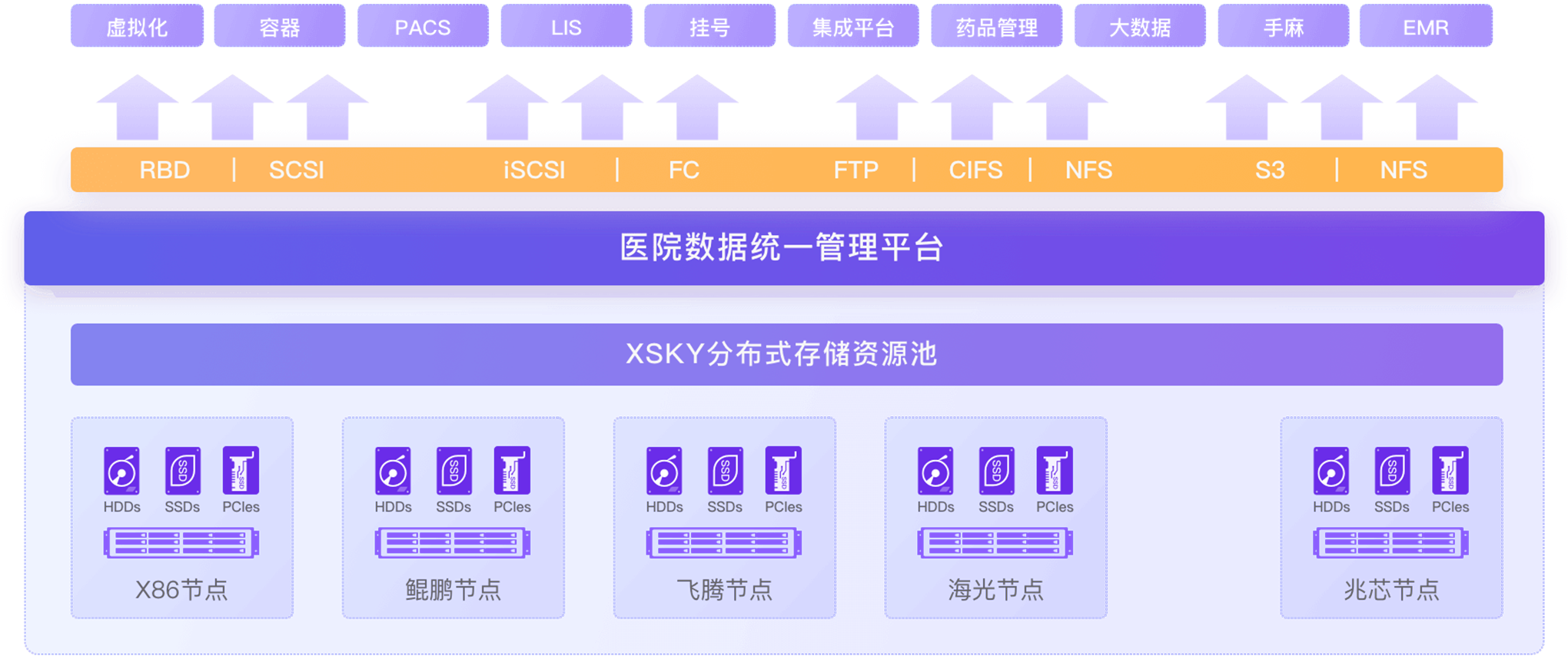 XSKY星辰天合将自身先进的软件定义存储技术和行业经验,与智慧医疗数据场景相结合, 采用统一数据管理平台(XEDP)构建医院数据湖,将分散在各院区、各系统、不同种类的数据统一迁移纳管, 让数据真正“活”起来,成为医院日常运营所依赖的核心。